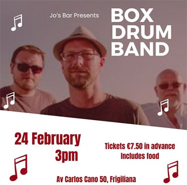 FRIGILIANA – The Box Drum Band (met onder anderen de in de Axarquía-regio populaire zanger en gitarist Lee Townsend in de gelederen) treedt zaterdagmiddag 24 februari op in het bergdorp Frigiliana, op circa vijf kilometer landinwaarts van Nerja gelegen.