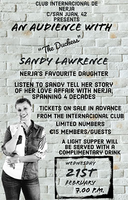NERJA – Bij Club International de Nerja, aan de Calle San Juan 42 in Nerja, staat woensdagavond 21 februari een optreden gepland van de zangeres Sandy Lawrence.
