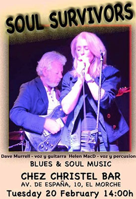 Soul Survivors bestaat uit Dave Murrell (gitaar en zang) en drummer/zangers Helen MacD. Bar Chez Christel is te vinden in aan de Avenida de España 10 in de kustplaats El Morche (bij Torrox). Het optreden begint dinsdag om circa 14.00 uur.