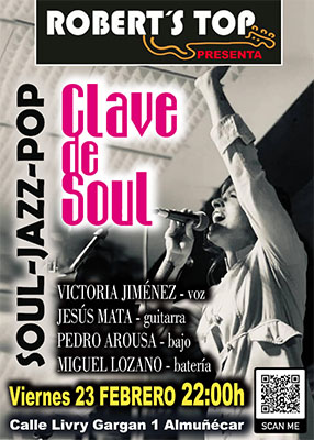 ALMUNECAR – Bij bar/restaurant Robert’s Top in Almuñécar staat vrijdagavond 23 februari een optreden geprogrammeerd van de band Clave De Soul. Het optreden begint rond 22.00 uur.