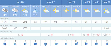 Voor de rest van de komende week verwachten de meteorologen géén neerslag en gemiddelde dagtemperaturen die tegen de 20 graden-grens aanhikken. Op dinsdag 27 februari wakkert de wind aan, om in de dagen daarna weer te gaan liggen. Met ingang van woensdag 28 februari neemt de zon de regie weer over aan de Costa del Sol, waarbij er wél sprake is van voorbij drijvende wolkendekken.