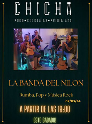 FRIGILIANA – De formatie La Banda del Nilon treedt zaterdagavond 2 maart op bij restaurant Chicha aan het Plaza de las Tres Culturas in Frigiliana. De formatie brengt voornamelijk rumba-, pop- en rockmuziek ten gehore.
