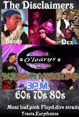 TORROX – De band The Disclaimers treedt zaterdagmiddag 2 maart op in de kustplaats Torrox, op circa tien kilometer van Nerja gelegen. Dit gebeurt in O’Leary’s Irish Bar aan de Paseo Maritímo de Ferrara.