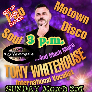 TORROX – De Britse zanger Tony Whitehouse treedt zondagmiddag 3 maart op bij O’Leary’s Irish Bar in de kustplaats Torrox. Het optreden begint rond de klok van 15.00 uur.