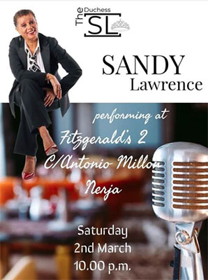 Optreden zangeres Sandy Lawrence bij Fitzgerald’s Bar II NERJA – De zangeres Sandy Lawrence treedt zaterdagavond 2 maart op bij Fitzgerald’s Bar II aan de Calle Antonio Millón 2 in het centrum van Nerja. Het optreden begint rond de klok van 22.00 uur, de bar is geopend vanaf 19.00 uur. Delen: Klik om te delen op X (Opent in een nieuw venster) X Klik om te delen op Facebook (Opent in een nieuw venster) Facebook Vind-ik-leuk Aan het laden...