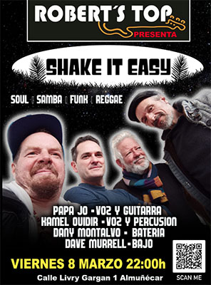 ALMUNECAR – Bij bar/restaurant Robert’s Top in Almuñécar treedt vrijdagavond 8 maart de band Shake It Easy op. Het optreden begint rond 22.00 uur.