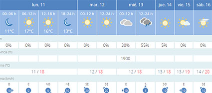 Maandag 11 en dinsdag 12 maart verwachten de meteorologen volop zon en dagtemperaturen die schommelen rond 18 graden Celsius, op woensdag 13 maart wordt het volgens de huidige verwachtingen grotendeels bewolkt en bestaat er een kleine kans op neerslag. Voor de rest van de komende week komt de zon dan weer terug en stijgen de gemiddelde dagtemperaturen naar circa 20 graden Celsius.