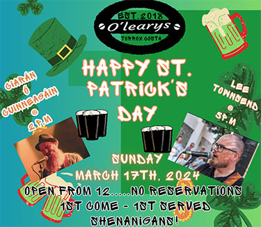 TORROX – De Ierse pub O’Leary’s in Torrox viert zondag 17 maart de Ierse nationale feestdag St. Patricks Day met optredens van de zangers/gitaristen Ciarán Ó´Cuínnegáin en Lee Townsend.