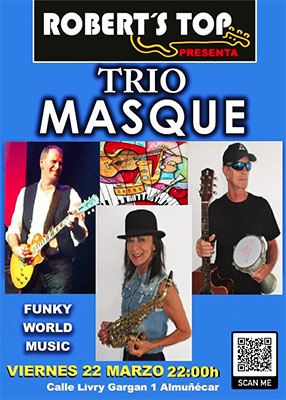 Het Trio Masque brengt zogeheten ´funky worldmusic´ ten gehore en bestaat uit Spike Evans (gitaar), Russel Roberts (drum en gitaar) en Christine Quayle (zang, fluit, saxofoon). De bar is gevestigd aan de Calle Livry Gargan 1 in de kustplaats Almuñécar, een kleine twintig kilometer boven Nerja.