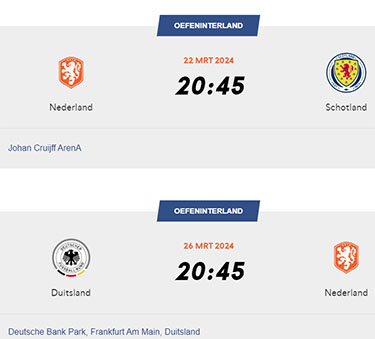 Op vrijdagavond 22 maart staat in de Johan Cruijff ArenA van Amsterdam een oefenduel met Schotland op de rol. De wedstrijd begint om 20.45 uur. Vier dagen later (dinsdagavond 26 maart) speelt Oranje in het Deutsche Bank Park in Frankfurt am Main een wedstrijd tegen Duitsland (eveneens vanaf 20.45 uur). Beide duels zijn rechtstreeks te volgen bij bar El Fuego, waar de komende dagen ook andere voetbalinterlands zijn te zien.