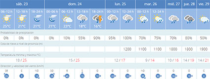Na dit weekeinde is er in de huidige weersverwachtingen van Aemet sprake van een spectaculaire terugval van temperatuur (van 25 naar 17 graden). De weerkundigen voorzien van maandag 25 tot en met donderdag 28 maart een grote kans op neerslag én een krachtige tot harde wind voor de eerste dagen van de komende week.
