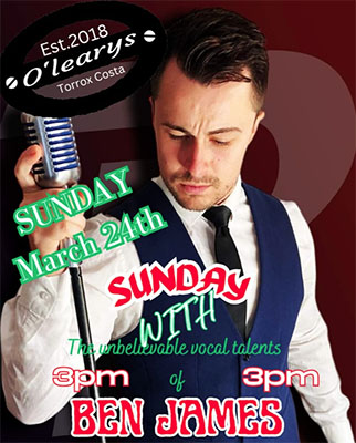 TORROX – De Britse zanger/gitarist Ben James treedt zondagmiddag 24 maart op bij O’Leary’s Irish Bar in de kustplaats Torrox. Het optreden begint rond de klok van 15.00 uur.