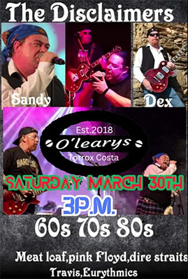 TORROX – De band The Disclaimers treedt zaterdagmiddag 30 maart op in de kustplaats Torrox, op circa tien kilometer van Nerja gelegen. Dit gebeurt in O’Leary’s Irish Bar aan de Paseo Maritímo de Ferrara.