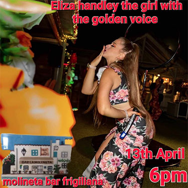 FRIGILIANA – De zangeres Eliza Handley treedt zaterdagavond 13 april op bij bar La Molineta Frigiliana. Deze bar is te vinden aan de Carretera Frigiliana, de weg tussen Nerja en Frigiliana.