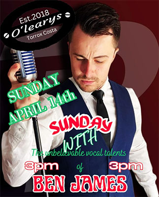 TORROX – De Britse zanger/gitarist Ben James treedt zondagmiddag 14 april op bij O’Leary’s Irish Bar in de kustplaats Torrox. Het optreden begint rond de klok van 15.00 uur.