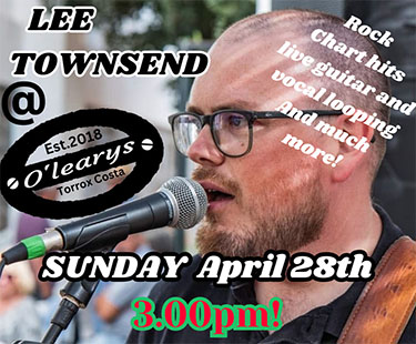 TORROX – De, in de regio rond Nerja veel optredende, Britse zanger/gitarist Lee Townsend treedt zondagmiddag 28 april op bij O’Leary’s Bar aan de Paseo Maritímo de Ferrara in Torrox-Costa. Het optreden begint om circa 15.00 uur, de toegang is vrij.