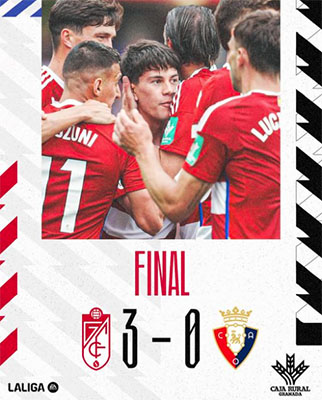 GRANADA – Granada CF heeft zondagmiddag 28 april het laatste sprankje hoop op een verlenging van het verblijf in de hoogste Spaanse voetbalafdeling, La Liga, nieuw leven ingeblazen. De Andalusische club, voorlaatste in de huidige competitiestand, liet opponent en middenmoter CA Osasuna in het eigen Nuevo Los Cármenes-stadion kansloos: 3-0.