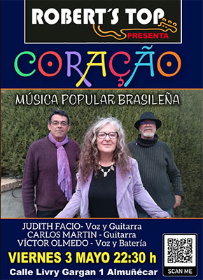 ALMUNECAR – Bij bar/restaurant Robert’s Top in Almuñécar staat vrijdagvond 3 mei een optreden geprogrammeerd van de Braziliaanse formatie Coração. Het optreden begint rond 22.30 uur.
