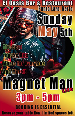PUNTA LARA – Bij Bar Oasis in Punta Lara, een dorp aan de kust nèt buiten Nerja richting Torrox, treedt zondagmiddag 5 mei ‘The reggae rock star Magnet Man’ op. De bar is te vinden aan de Calle María 2.