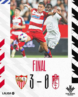 SEVILLA – Op de 34ste speeldag van de Spaanse voetbalcompetitie in ´La Liga´ heeft het Andalusische Granada CF de uitwedstrijd tegen Sevilla FC kansloos verloren. De thuisclub had weinig moeite met de degradatiekandidaat: 3-0.