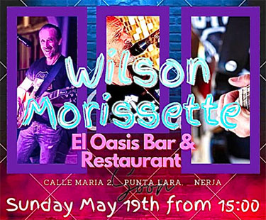 PUNTA LARA – Bij Bar Oasis in Punta Lara, een dorp aan de kust nèt buiten Nerja richting Torrox, treedt zondagmiddag 19 mei de zanger en gitarist Wilson Morissette op. De bar is te vinden aan de Calle María 2.