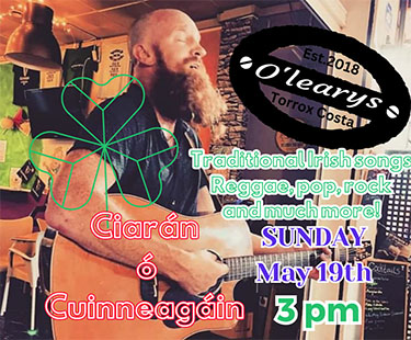 TORROX – De Ierse zanger en gitarist Cíarán Ó´Cuínneagáin treedt zondagmiddag 19 mei op bij O’Leary’s Irish Bar aan de Paseo Maritímo de Ferrara in de kustplaats Torrox.