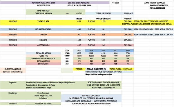 NERJA – De Spaans/Nederlandse tapasbar Tapas Plaza aan de boulevard van Playa Burriana is door de organiserende vereniging AEN uitgeroepen tot winnaar van de tiende Ruta de la Tapa de Nerja 2024. De tapasroute werd dit jaar afgewerkt tussen 8 april tot en met 21 april, vijftien tapasbars en restaurants namen daar aan deel.
