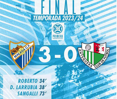 MALAGA – Na een magere reeks van drie gelijke spelen en één verliespartij heeft de Andalusische voetbalclub Málaga CF zaterdagavond 18 mei de voorlaatste competitiewedstrijd in de Spaanse Primera Federación in winst weten om te zetten. In het eigen La Rosaleda-stadion werd middenmoter Antequera CF met 3-0 verslagen.
