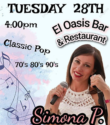 PUNTA LARA – Bij Bar Oasis in Punta Lara, een dorp aan de kust nèt buiten Nerja richting Torrox, treedt dinsdagmiddag 28 mei de zangeres Simona Pittari op. De bar is te vinden aan de Calle María 2.