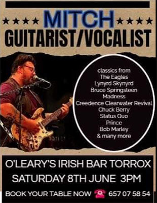 NERJA – De zanger en gitarist Mitch treedt zaterdagmiddag 8 juni op bij O’Leary’s Irish Bar in de kustplaats Torrox. Het optreden begint rond de klok van 15.00 uur, de toegang is vrij.