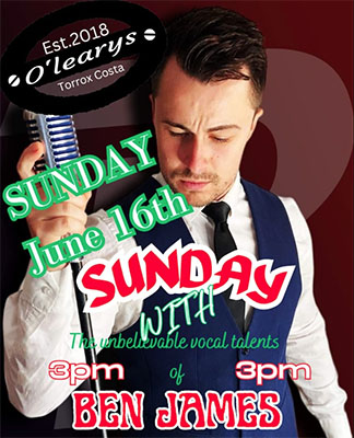 TORROX – De Britse zanger/gitarist Ben James treedt zondagmiddag 16 juni op bij O’Leary’s Irish Bar in de kustplaats Torrox. Het optreden begint rond de klok van 15.00 uur.