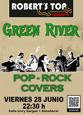 ALMUNECAR – Bij bar/restaurant Robert’s Top, in de kustplaats Almuñécar, staat vrijdagavond 28 juni een optreden geprogrammeerd van de band Green River. Het optreden begint rond 22.30 uur en duurt ongeveer twee uur.
