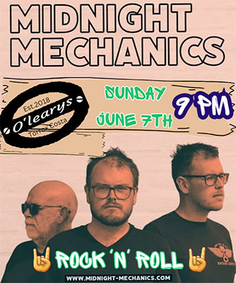 TORROX – In de kustplaats Torrox, op circa tien kilometer van Nerja gelegen, treedt zondagavond 7 juli de band Midnight Mechanics op bij O’Learys Irish Bar aan de Paseo Maritímo de Ferrara.