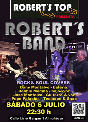 ALMUNECAR – In bar/restaurant Robert’s Top in Almuñécar staat zaterdagavond 6 juli een optreden geprogrammeerd van Robert´s Band. Het optreden begint rond 22.30 uur.