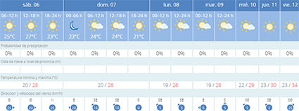 In de huidige weersvoorspellingen van het weerstation Aemet (Agencia Estatal de Meteorología) is zelfs sprake van een gemiddelde dagtemperatuur voor vrijdag 12 juli van 34 graden Celsius. De wind gaat na dit weekeinde liggen, van kans op neerslag is voorlopig geen sprake.