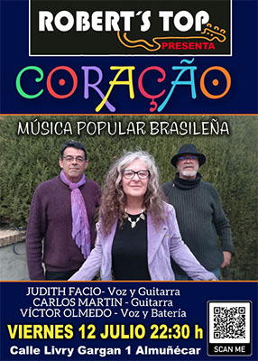 ALMUNECAR – Bij bar/restaurant Robert’s Top in Almuñécar staat vrijdagavond 12 juli een optreden geprogrammeerd van de Braziliaanse formatie Coração. Het optreden begint rond 22.30 uur.