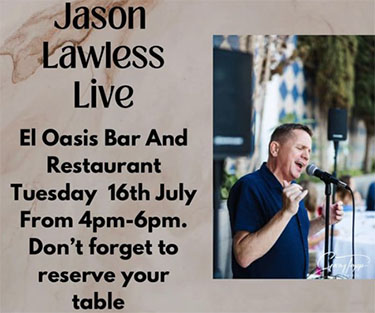 PUNTA LARA – Bij Bar Oasis in Punta Lara, een dorp aan de kust nèt buiten Nerja richting Torrox, treedt dinsdagmiddag 16 juli de zanger Jason Lawless op. De bar is te vinden aan de Calle María 2.
