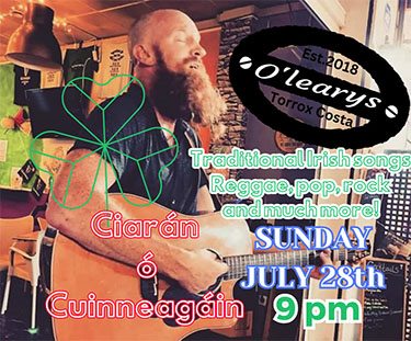 TORROX – De Ierse zanger en gitarist Cíarán Ó´Cuínneagáin treedt zondagavond 28 juli op bij O’Leary’s Irish Bar aan de Paseo Maritímo de Ferrara in de kustplaats Torrox.