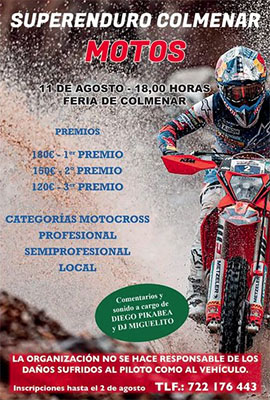 COLMENAR – In het bergdorp Colmenar, op zo’n dertig kilometer landinwaarts van Málaga gelegen, wordt op zondagavond 11 augustus een motocross verreden. Het evenement staat in het kader van het jaarlijkse dorpsfeest, dat wordt gevierd van donderdag 8 tot en met zondag 11 augustus.