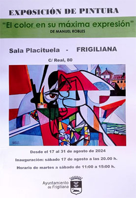 FRIGILIANA – In de Sala Placituela van Frigiliana wordt zaterdag 17 augustus om 20.00 uur de expositie ´El color en su máxima expresión´ van de kunstenaar Manuel Robles geopend. De Sala Placituela is te vinden aan de Calle Real 80 in het dorp Frigiliana, circa zeven kilometer boven Nerja landinwaarts gelegen.