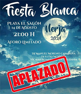 NERJA – De organisatoren van de dertiende editie van de Fiesta Blanca in Nerja hebben besloten het, voor vanavond (woensdag 14 augustus) geplande, jaarlijkse feest uit te stellen. Dit in verband met de huidige weersverwachtingen en de mogelijke stormwinden/golven vanavond op het strand van Playa El Salon.