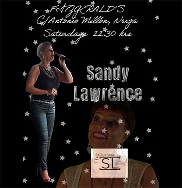 NERJA – De zangeres Sandy Lawrence treedt zaterdagavond 17 augustus weer op bij Fitzgerald’s Bar II aan de Calle Antonio Millón 2 in het centrum van Nerja.