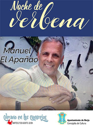 NERJA – In het kader van het culturele activiteitenprogramma ´Verano en Los Cangrejos´van de gemeente Nerja is er dinsdagavond 27 augustus een animatieprogramma voorzien op het Plaza de los Cangrejos, onder de naam ‘Noche de Verbena´. Dit begint rond de klok van 22.00 uur. Deze ´Noche de Verbena´ wordt verzorgd door de artiest Manuel el Apañao.