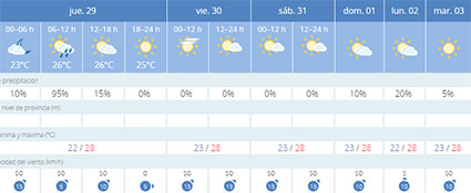 Volgens de jongste weersverwachtingen kunnen de buien aanhouden tot circa het middaguur. Donderdagmiddag en de dagen erna (tot en met maandag 2 september) wordt geen neerslag verwacht maar is het bij tijd en wijle wél bewolkt rond Nerja. De gemiddelde dagtemperaturen blijven volgens de meteorologen de komende week schommelen rond de 28 graden Celsius, de wind is daarbij matig tot zwak.