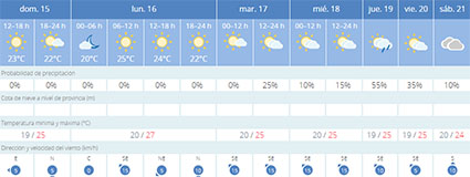 Wél is daarbij af en toe sprake van veel voorbijtrekkende wolkendekken. Voor donderdag 19 september voorzien de weerkundigen een kleine kans (55 procent) op neerslag, de wind is de komende dagen zwak tot matig boven Nerja en omgeving.