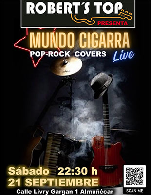 ALMUNECAR – De band Mundo Cigarra treedt zaterdagavond 21 september op bij bar/restaurant Robert’s Top in Almuñécar. De formatie brengt vooral rumba-, pop- en rockmuziek ten gehore.