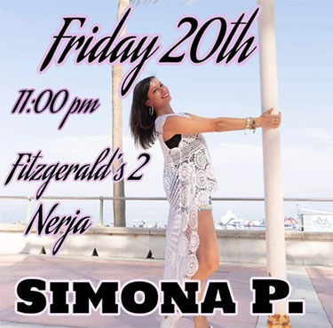 NERJA – De zangeres Simona Pittari treedt vrijdagavond 20 september op bij Fitzgerald’s Bar II, in het centrum van Nerja aan de Calle Antonio Millón 2.