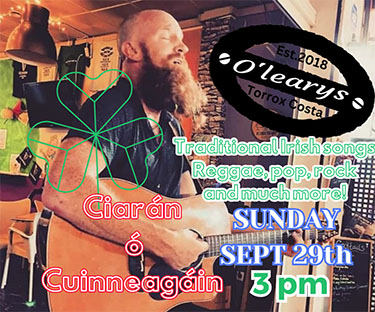 TORROX – De Ierse zanger en gitarist Cíarán Ó´Cuínneagáin treedt zondagmiddag 29 september op bij O’Leary’s Irish Bar aan de Paseo Maritímo de Ferrara in de kustplaats Torrox.