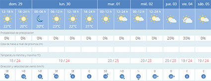 NERJA – De komende dagen blijft het warm met veel zon en gemiddelde dagtemperaturen tussen de 24 en 28 graden Celsius in Nerja en naaste omgeving. Daarbij waait af en toe een matige tot zwakke wind, van een kans op regen is geen sprake in de huidige vooruitzichten van de Spaanse meteorologische dienst Aemet (Agencia Estatal de Meteorología).