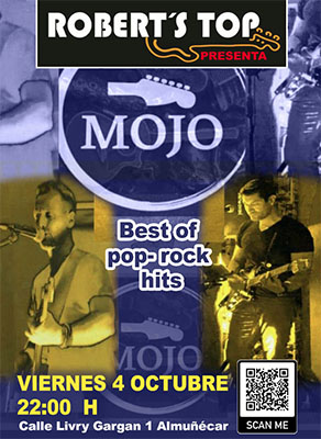 ALMUNECAR – In bar/restaurant Robert’s Top in Almuñécar staat vrijdagavond 4 oktober een optreden geprogrammeerd van de band Mojo. Het optreden begint rond 22.00 uur.